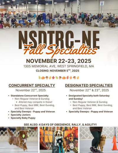 Thank you for taking an interest in the NSDTRC-NE's fall specialty event! The 2025 event brings you 3 specialties - 2 designated and 1 concurrent! The concurrent includes specialty juniors and specialty baby puppy, and sweepstakes for puppy and veteran are offered for all 3.